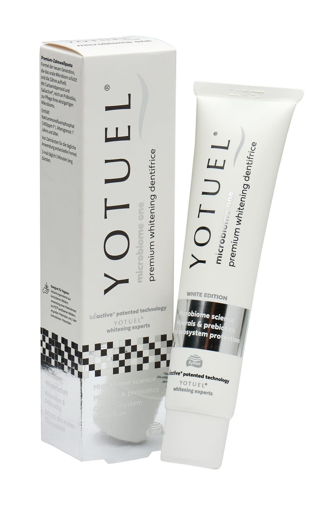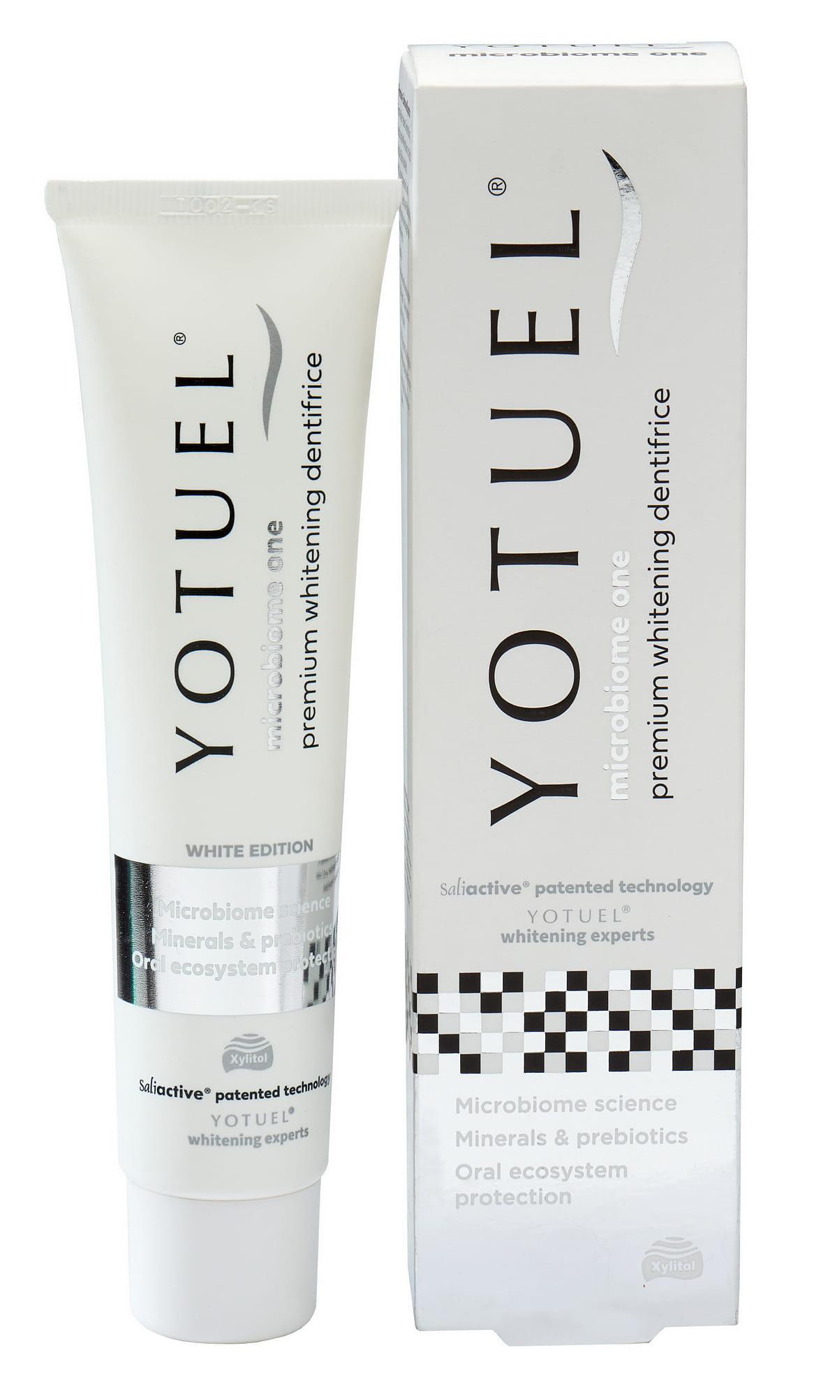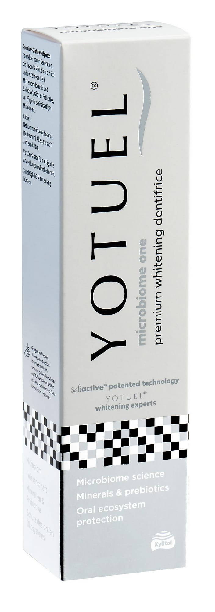 YOTUEL MICROBIOME ONE - to ekskluzywna pasta do zębów z formułą nowej generacji, która chroni mikrobiom jamy ustnej i wybiela zęby. Pasta bogata w prebiotyki stworzona przez dentystów do codziennego stosowania. Zawiera opatentowaną kombinacją Saliactive®, nadtlenek mocznika oraz monofluorofosforan sodu (1450 ppm).